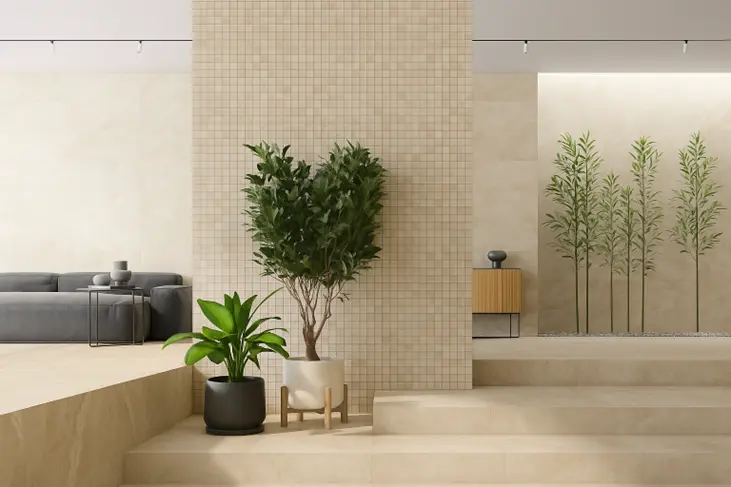 - ابعاد سرامیک: برای فضاهای بزرگ (مانند سالن پذیرایی) استفاده از سرامیک بزرگ (مثل ۱۰۰×۱۰۰ سانتیمتر) باعث ظاهری بیدرز و مدرن میشود. در فضاهای کوچکتر یا دیوارها، میتوانید از سایزهای کوچکتر یا حتی آجرکهای ظریف استفاده کنید تا تعادل ایجاد شود.